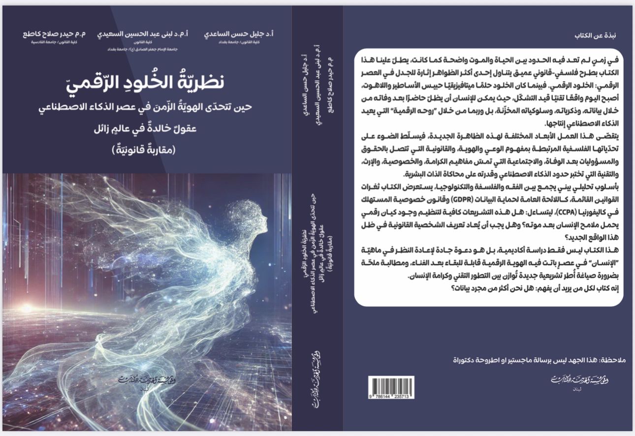Ein neues wissenschaftliches Werk mit dem Titel „Theorie der digitalen Unsterblichkeit: Wenn Identität die Zeit im Zeitalter der Künstlichen Intelligenz herausfordert – Unsterbliche Köpfe in einer vergänglichen Welt – eine rechtliche Annäherung“ ist erschienen. Es ist Teil der wissenschaftlichen Bemühungen, die darauf abzielen, der Gesellschaft zu dienen und die neuesten Entwicklungen in den Rechtswissenschaften zu verfolgen. Es handelt sich um eine gemeinsame Veröffentlichung von Professor Dr. Jalil Hassan Al-Saadi (wissenschaftlicher Assistent an der juristischen Fakultät der Universität Bagdad), Assistenzprofessor Dr. Lubna Abdul Hussein Al-Saidi und dem Lehrbeauftragten Haidar Salah Kati.