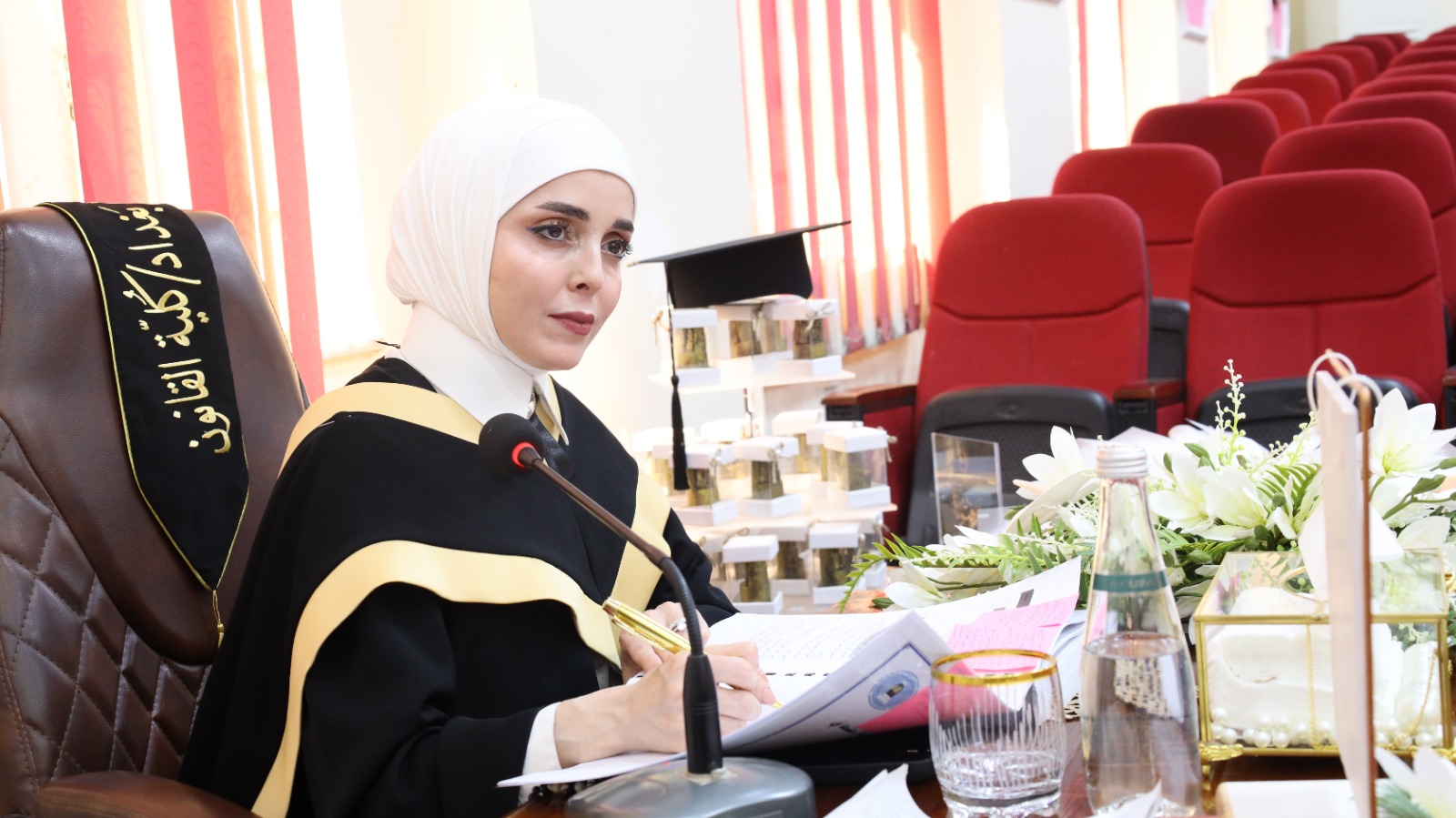 Anfal Isam Ali- eine Studentin im Öffentlichen Recht- präsentierte ihre Doktorarbeit am Montag, dem 8. September 2025, in der Konferenzhalle der Fakultät in der Rechtsbereichen und Geldern im Verwaltungsrecht an der juristischen Fakultät der Universität von Bagdad.